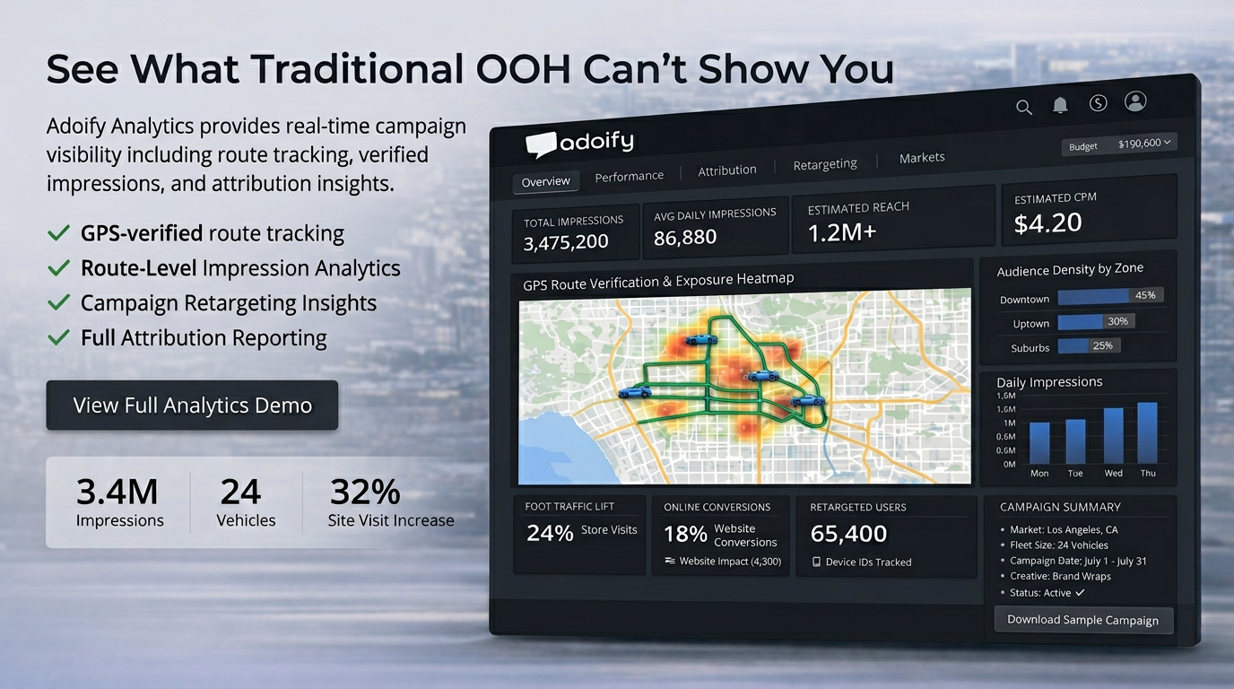 We specialize in Uber, Lyft, DoorDash and Taxi Advertising, AdTrucks, AdBikes, AdWalkers, and Experiential Advertising—delivering impactful OOH campaigns across North America. Let’s launch a successful mobile billboard campaign that drives real results for your business.